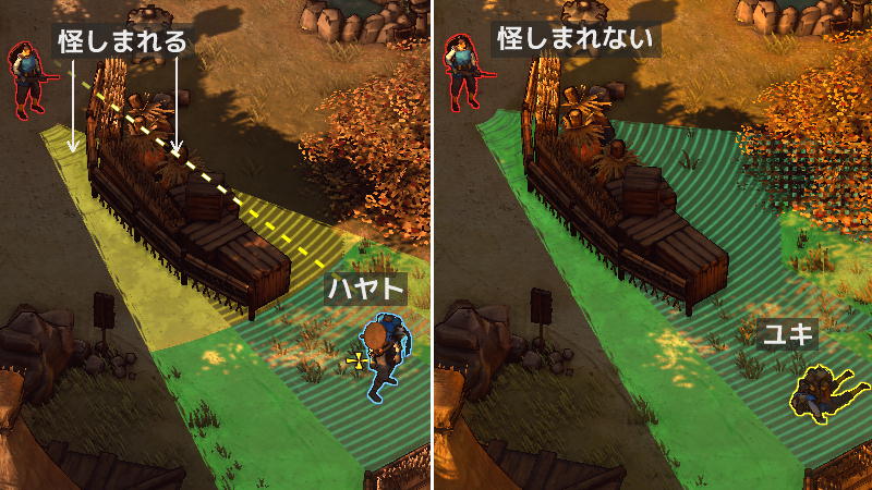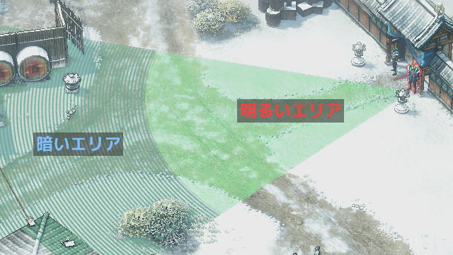 雪の上を歩くとハヤトたちの足跡が残ります。この足跡を見つけた敵兵の視認範囲は黄色くなり、足跡を追います。ただし、足跡も視認範囲の縞々の部分であれば見つかりません。