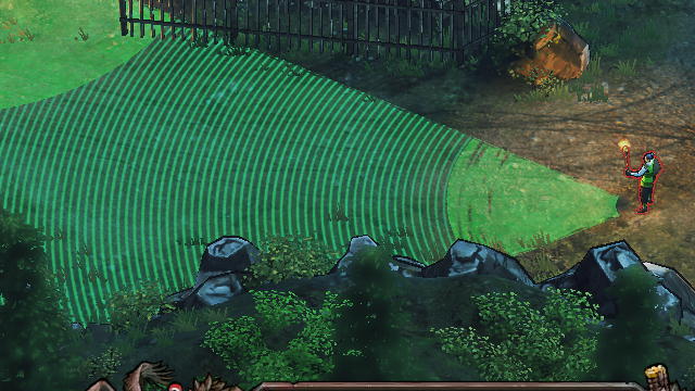 茂みや岩などの背の低い環境物に視界が遮られると縞模様になり、建物などの裏は視界が完全に遮断されます。また、敵兵より高い位置にある場所の視認範囲も縞模様になります。