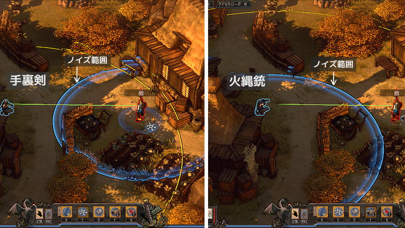 音の大きさはスキル説明の「ノイズ半径」で確認できます。攻撃対象を指定するときに青い円が表示され、その範囲内に敵兵がいると怪しまれます。 銃は使用者を中心に発生します(*)。 ※ 銃声を聞かれたときは即警報を鳴らされます。