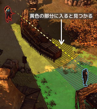 怪しんでいるときは視認範囲が黄色になります。この黄色の部分にハヤトたちが入ると見つけた段階になり視認範囲が赤くなります。