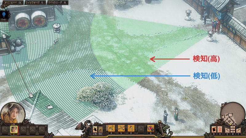 ハヤトたち(プレイヤーキャラクター)に対する敵兵の反応を「検知」とし、すべての行動が検知される視認範囲を「検知(高)」、しゃがんでいれば検知されない視認範囲を「検知(低)」とします。ゲーム内の説明では「明るいエリア」「暗いエリア」となっています。