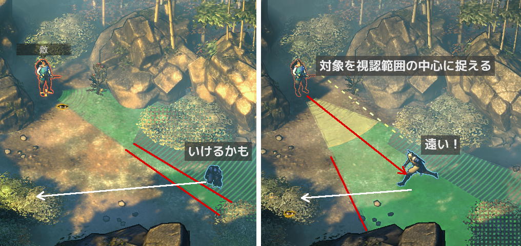 初めてプレイするときは、画像の左側のような場合は、怪しまれても赤い線の部分を走り抜ければ見つからないと思ってしまうかもしれないのですが、実際に実行すると見つかります。